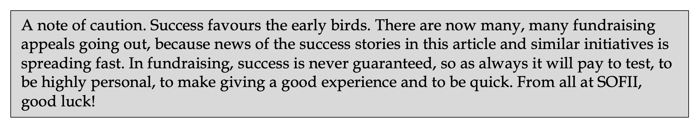 We hope this short, very partial review of fundraising success at a time of crisis will lift spirits everywhere and give fundraisers around the world confidence and courage to continue to talk positively to donors and to give all supporters the opportunity to be engaged and involved in what they really love doing – making a difference for others at a time of great need, through the causes and initiatives that they believe in.