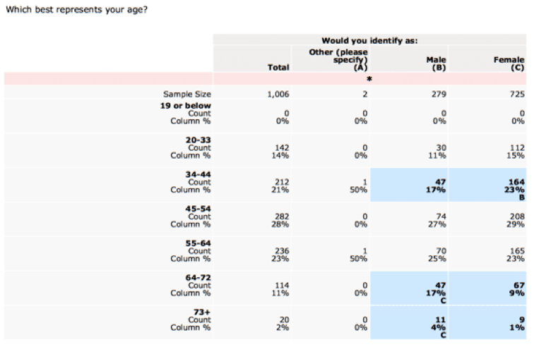 Look at this chart from the data collected for the Nonprofit Sector Leadership Report. We looked at the ages of the men and women who answered the survey. (The blue indicates a statistically significant difference.) Notice that the percentage of women vs men increases as the ages get younger.