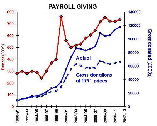 The latest data from HMRC show a small increase in the number of donors making use of payroll giving in the tax year 2011-12 (red line in the chart below). This is good news as far as it goes but – as the graph shows – use of the scheme has not yet recovered to the level of 2008-09 (ignore the previous peak around the start of this millennium, which was due to a short-term scheme calledChildren’s Promise).