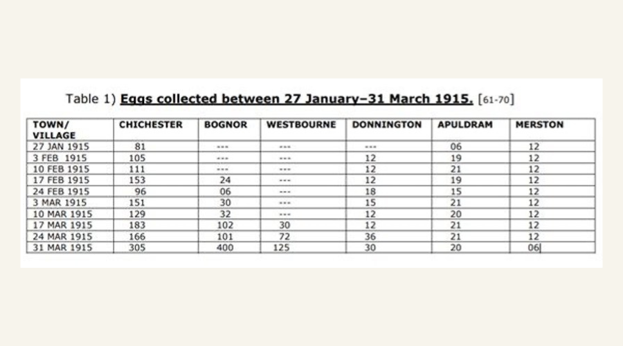 In 1915, villages across England had set up their own egg collection depots and were recording the weekly tally of donated eggs. And on January 20th of the same year, an article headed ‘New laid eggs for wounded soldiers; who will help?’ in the Chichester Observer and West Sussex Recorder launched the local scheme. It announced the opening of the Chichester Egg Collection Depot and that Mrs Close, the coordinator, ‘hopes to find someone from each village to undertake to collect the eggs and convey them’ to Chichester.