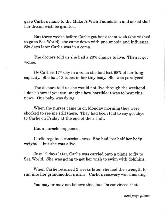 But three weeks before Carlie got her dream wish (she wished to go to Sea World), she came down with pneumonia and influenza. Six days later Carlie was in a coma.