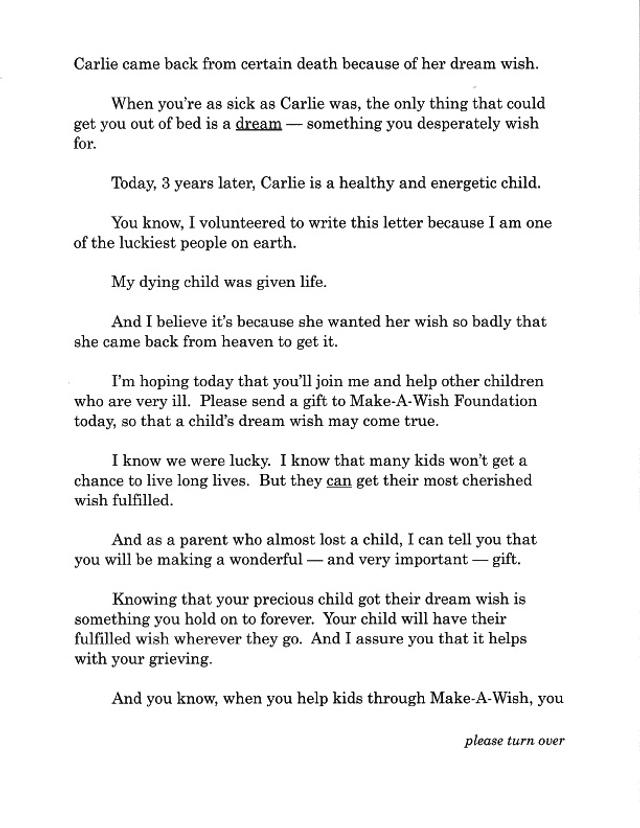 ‘Make-A-Wish donors who did not know this child’s story made gifts hoping to help a child, and this is exactly what happened. The reader is invited to become one of these generous people. Later I ask them again to act while the letter is in their hands. It’s a directive telling them exactly what they need to do.’