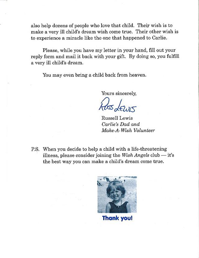 ‘Now we have arrived at the actual ask. You have to ask for the money,’ Harvey stresses. ‘How often you may ask depends on the letter. Many times I ask on the first page of the letter. For instance, if it’s a “house” mail piece going to current donors, there’s a good chance it is only a two-page letter, in which case you need to give the reader the proposition immediately. But Carlie’s story has more emotion than many of the letters I write. I wanted people to take the journey, to be thrilled that this child lived and to explain that her parents really believed – and they dobelieve – that it was because of Make-A-Wish that she survived.