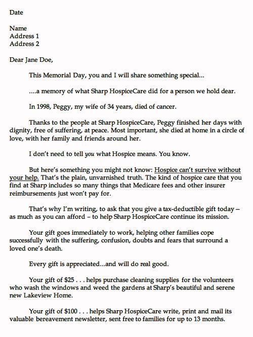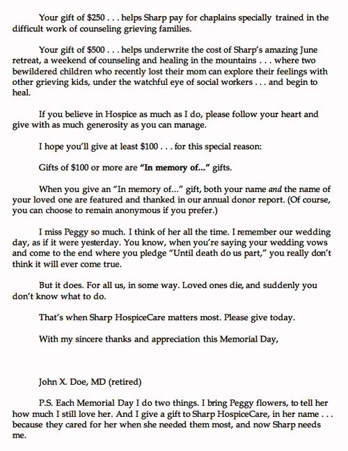 ‘Thanks to the people at Sharp HospiceCare… This section is there just to remind them what’s so wonderful about the hospice. I am hoping that the reader agrees how wonderful hospices are. This really came out of my experience and, as I do a lot when I write direct mail, I tried to reach into what I know emotionally. Donors love the idea of helping to relieve pain.