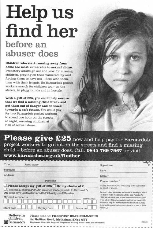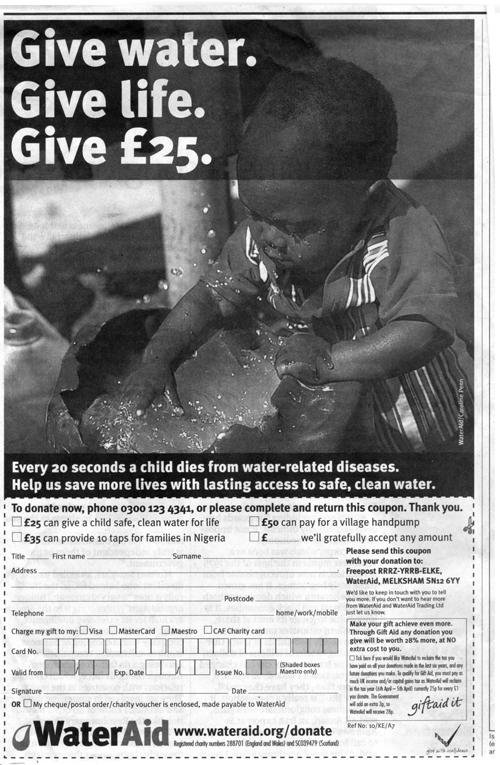 Using these techniques it is possible to ensure that your fundraising press campaigns are constantly optimised. These methods mostly apply equally to loose inserts and direct mail. The important thing is never to believe that you’ve cracked it. You must keep an open mind, question absolutely everything and never jump to conclusions about what is working and what isn’t until you’ve seen it conclusively and rigorously proved. Most of all don’t fall for the folklore that surrounds fundraising advertising. For instance, ‘everybody knows’ that it is important to be single-minded and that giving respondents choices lowers response. Well, don’t you believe it until you’ve tried it. It is indeed extremely important that the main proposition should be single-minded but there is no reason why the call to action shouldn’t give options. Take the example of the WaterAid advertisements shown earlier with their different propositions for a press advertisement and a loose insert. They both work perfectly well but it is intriguing to wonder what the return on investment would have been if the loose insert‘s response form had offered the option of a £25 one-off gift and the advertisement’s coupon – perhaps larger – had contained a regular direct debit mandate.