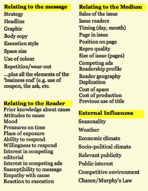 In fact, it is sobering to consider some of the factors that can combine to determine the response and return on investment to a particular insertion of a press advertisement. The list in Table 1 is probably not exhaustive.