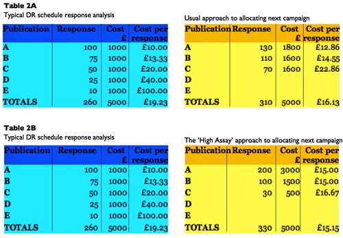 The essence of the high assay method is not to be frightened of backing success and to accept diminishing returns up to the point that it becomes uneconomic. Of course, in the real world all this can by turned upside-down by good media buying – almost any publication can become cost-effective at the right price and the threat of being dropped from the schedule can sometimes concentrate publishers’ minds wonderfully. It is also essential to search constantly for untried publications that might work and to test various ad shapes and sizes, positions in the publications and different days of the week in newspapers, seasons, frequency of insertions, closeness of insertions, etc.