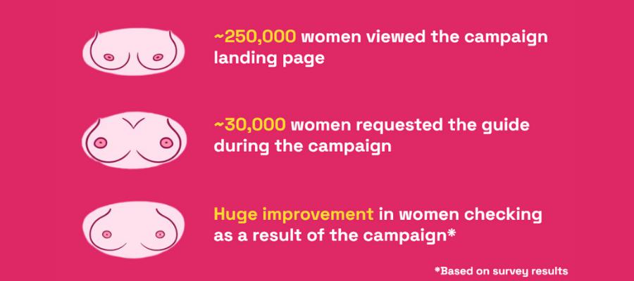 A quarter of a million women viewed the landing page for the campaign and nearly 30,000 women downloaded the guide. Survey results showed there was a huge improvement in women checking their breasts, as a result of the campaign.