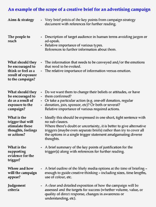 Above all, it is vital that briefs are not restrictive. They should be written to stimulate fresh thinking and not to direct thinking along restrictive tramlines. Briefs must not be so broad and vague as to allow anything nor must they be so restrictive that the outcome is utterly predictable. The skill in writing a good brief is expressing it in a way that encourages relevant lateral thinking and allows for the surprising.