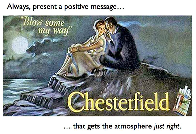 Not so long ago cigarettes were advertised by professional communicators not unlike us, with similar enthusiasms and passion for their product. We can learn from them, so that the Devil doesn’t have all the best tunes. Here’s a summary of just some of the lessons we might learn from the cigarette ads of yesteryear.