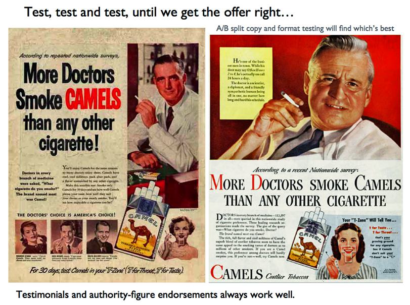 Below, two carefully constructed ads are tested side by side. The cigarette advertisers knew well the value of celebrity endorsements and rigorous testing. They used all of the direct marketer’s tricks of trade to present their product compellingly. Endorsement from doctors was a stroke of sheer brilliance of course, and shows I suppose that everyone has a price.