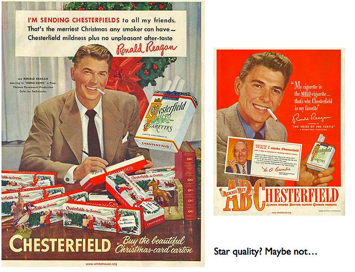 The ultimate celebrity endorsement is a bit of a toss-up between Santa Claus and actor (and future US President) Ronald Reagan sending all his pals bumper packs of fags. In the smaller of the two ads the advertiser has inexplicably added a secondary endorsement from a bald-headed, middle-aged individual named as Mr Y.O. Crombie. This curious introduction suggests that at this time in his undistinguished acting career the pulling power of Mr Reagan was waning, so the obscure Mr Crombie was added, in the hope of bumping up response. If anyone can identify the mysterious Mr Crombie, please let SOFII know.