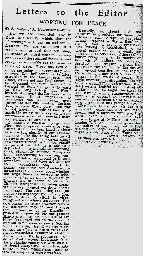 An avalanche of postcards saying ‘yes’ led to the formation of War on Want. Outraged by the UK’s involvement in a senseless war, publisher, Victor Gollancz, sent the letter opposite to The Guardian newspaper in 1951.