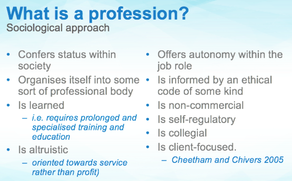 “Adisciplined group of individuals who adhere to ethical standards and who hold themselves out as, and are accepted by the public as possessing special knowledge and skills in a widely recognised body of learning derived from research, education and training at a high level, and who are prepared to apply this knowledge and exercise these skills in the interest of others.”