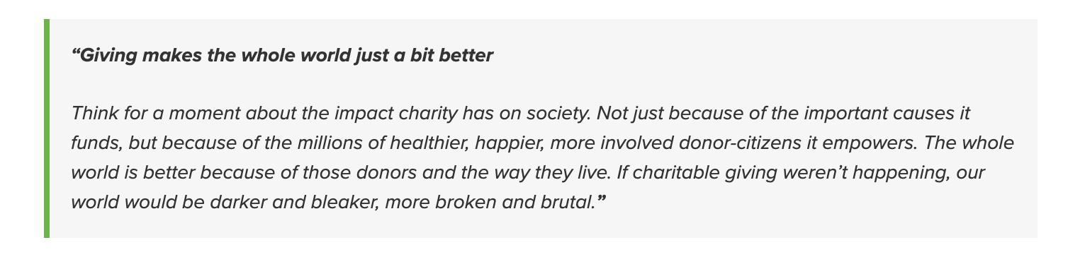 There are many factors affecting well-being. If a doctor can help you feel better, you’ll likely feel grateful to that doctor. In fact, this is a foundation of hospital ‘grateful patient’ fundraising. If a religious congregation can help you feel connected and supported, you’ll likely feel grateful to that congregation. In fact, this is a key tenet of faith-based fundraising. But you don’t need to be a healthcare or religious charity to help people feel better.