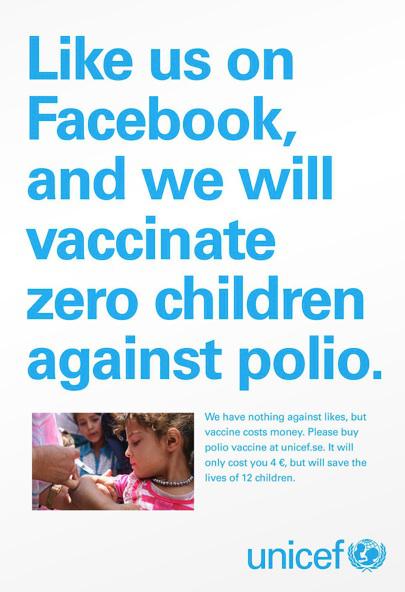 Unicef Sweden recently launched this attention-grabbing campaign about the need for real money, not ‘likes’ on social networking sites, for vital work on vaccinating children against polio.