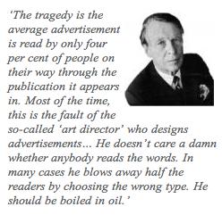 Ogilvy goes on to say, ‘The tragedy is the average advertisement is read by only four per cent of people on their way through the publication it appears in. Most of the time, this is the fault of the so-called “art director” who designs advertisements… He doesn’t care a damn whether anybody reads the words. In many cases he blows away half the readers by choosing the wrong type. He should be boiled in oil.’