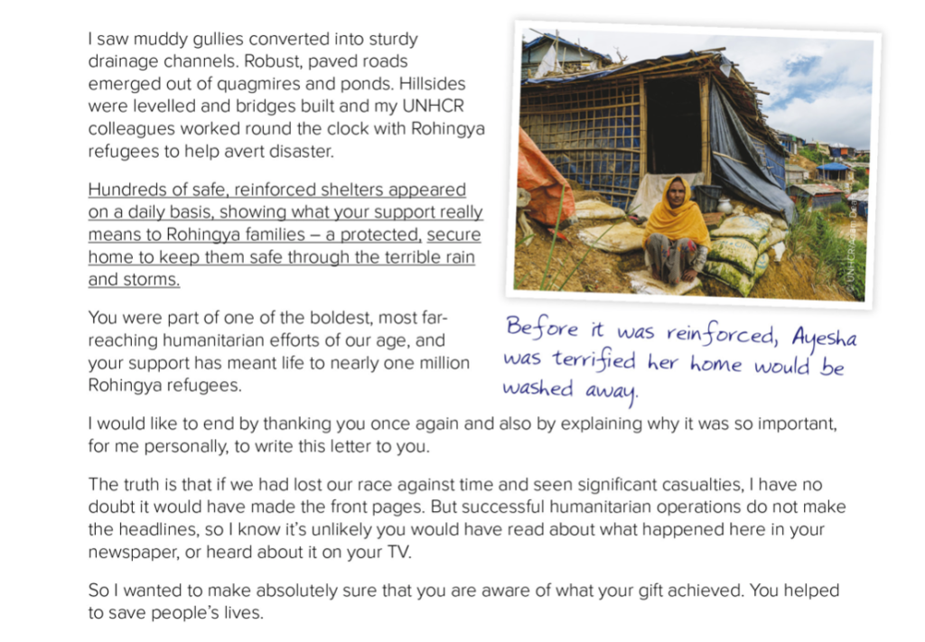 We recently did an Impact Report showing donors how they helped to protect Rohingya refugees from potential monsoon flooding in Bangladesh. It went out a full eight months after the monsoons, time that allowed us to step back, look at the full picture and put donors at the heart of the effort to protect refugees. The signatory was a UNHCR worker in Bangladesh and I make no apologies for including a lengthy extract from the letter, as it illustrates just how powerful it can be to show donors their impact.