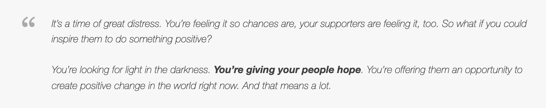 1. Get on the phone. Start by speaking to supporters who were in the midst of organising fundraisers for you. How are they managing? Speak to anyone who has just given a donation. Call up long standing past donors who have given over many years. You have never had a better reason. It doesn’t need to be a labelled as a “thank-a-thon”. Make existing supporters feel good. They’ve earned it.
