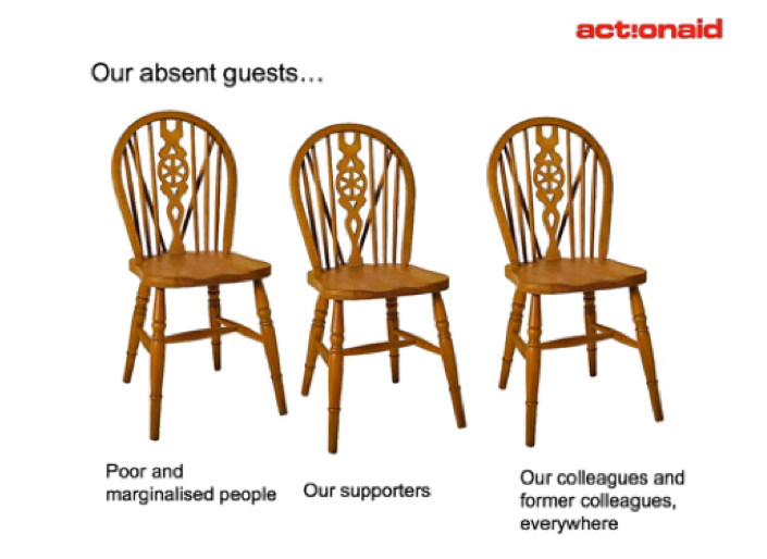 At one strategy planning meeting in Ethiopia our African regional director made a passionate plea. He said, ‘We should never forget that just outside this room, literally outside these doors, there are thousands of poor people all hugely interested in what we are discussing here, whose livelihoods and well-being are intricately linked to and affected by what goes on here, in this room today. So we created an imaginary empty seat at the board table as a symbolic way of reminding trustees constantly of the many millions of people that ActionAid exists to serve. We allocated a chair, space at the table, a glass, pencil and pad, as if for an absent guest.