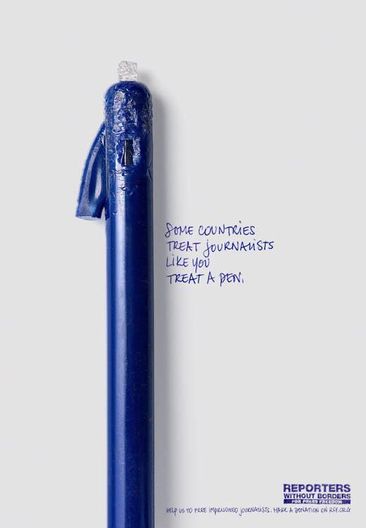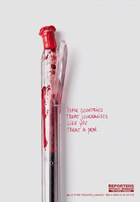 One of the ads in this series comes perilously close to working. It’s the version with the red pen, where the ink looks enough like blood to call to mind the violence journalists face.
