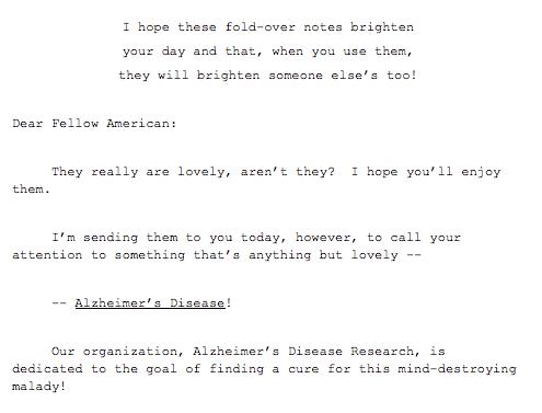 I was thinking about that the other day when a letter came to my house from the Alzheimer’s Disease Research. Usually when I look at a fundraising letter, I’m guilty of giving it a quick critical analysis. But in this case, I was immediately struck with a thought, ‘I wish I had written that letter’.