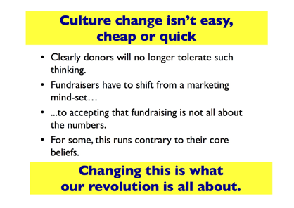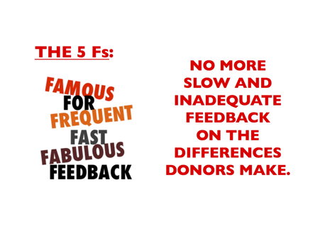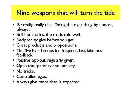 It also means no more putting donations ahead of donors; no more donors giving in spite of fundraisers rather than because of them; no more charity creative that makes non-donors feel bad rather than donors feel good. And it means achieving the five Fs: