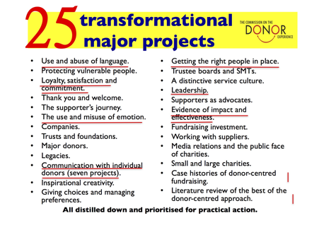 The Commission on the Donor Experience is still in its early stages, but Ken gives us a guess at some outcomes from the 25 main project areas:
