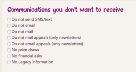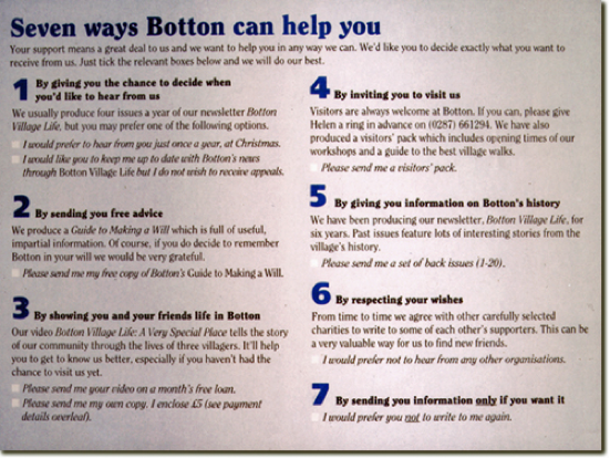 More than 30 years ago, a small charity in North Yorkshire called Botton Village showed the way by introducing a system now known as Continuous Donor Choice. See here. Botton Village is a working rural community where adults with a mental handicap can lead happy, productive lives living alongside ‘co-workers’ who don't have a mental handicap. In the late eighties, they started producing the reply form below, offering donors the opportunity to determine for themselves what they wanted to receive from Botton Village’s fundraisers rather than, what was up until then the universal norm, that fundraisers decided what donors should receive and just sent what they wanted their donors to have.