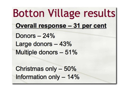 The results figures above come from the main pre-Christmas (October) appeal and are a five-year average from just five of the main donor segments that Botton Village mails. In this period the controversial ‘Christmas only’ segment never performed at less than 50 per cent response and the ‘information only’ segment – where supporters are not asked for money nor are they even sent a reply form and reply envelope – consistently performed at a level higher than many charities will achieve from their ‘warm’ file.