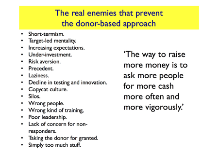 By focusing on these bad approaches, we risk losing awareness of what actually matters to donors – and therefore by implication, to us.