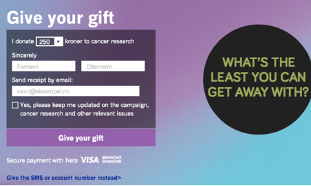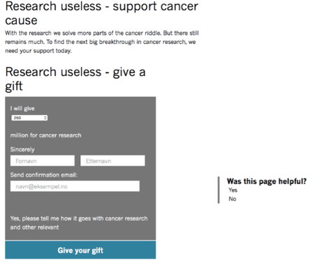 An example of a good way to include a donate section on a page from the Norwegian Cancer Society. (please note that Google translated the Norwegian text above the form to ‘research useless’ for some reason. The original text was that research can’t be accomplished without donations, which makes more sense!).