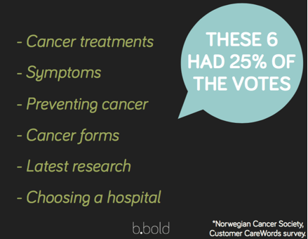 Beate cited the case of the Norwegian Cancer Society, who surveyed their website users and discovered that 25 per cent visited the site for the six following reasons: