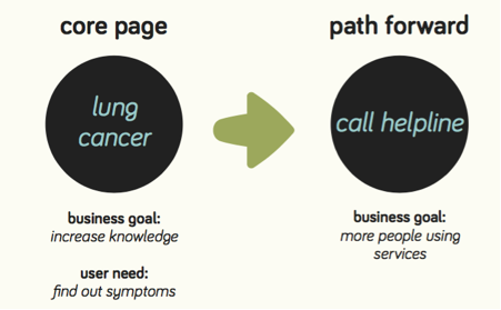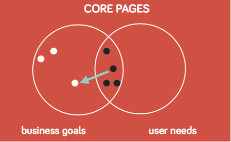 As you can see, once the core pages are established based on overlapping user needs and business goals, they can be used to lead to business goals that aren’t shared with the user needs, as per below.