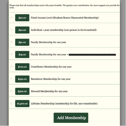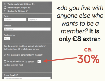 Conversely, one organisation took Beate’s advice and ended up with a much simpler field, with just three categories at the top, space to add personal details (name and address only) and also a short section offering people to add someone extra to the membership for only kr 75, i.e. eight euros extra. Approximately 30 per cent of users selected this option on top of their own subscription.