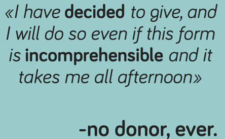 In fact, this form is pretty much as bad as it could be and Beate took us through what should be changed to shorten donors’ time spent completing them: