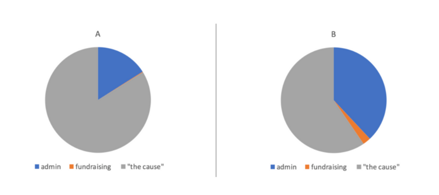 Often, you’ll see or hear advice that 90 per cent of income should be spent on the cause (i.e.: ‘overhead’ should be 10 per cent or below). Whatever the figure is, the pie chart/cents in the euro/pence in the pound format encourages donors to think that a lower percentage indicates a better, less wasteful organisation.