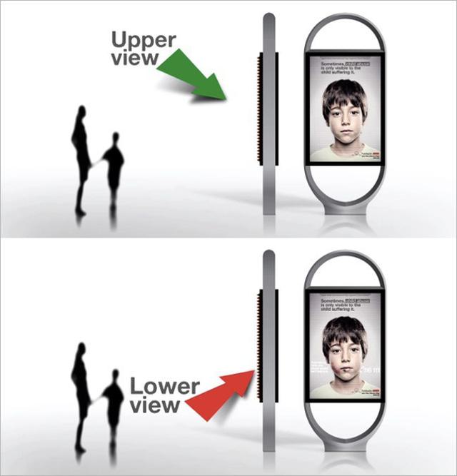 But when someone under four feet five inches (the average height of a 10 year old) looks at it, the visual is of a child with a bruised face with the text, ‘if somebody hurts you, phone us and we’ll help you’ along with the helpline number of ANAR.