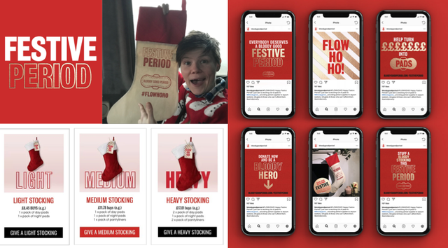 This was mostly a purely digital campaign, targeting their core audience of millennials who, instead of buying physical Christmas presents, could purchase a virtual one instead. The idea was simple: you could fill up a light, medium or heavy flow stocking with money and the money would then be turned into pads. Genius!