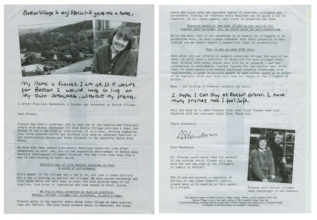 The positive depiction of life at Botton Village and the underlying philosophy, which speak loud and clear throughout the pack, have continued to be benchmarks of Botton Village and the Camphill Family's cold direct mail packs ever since.