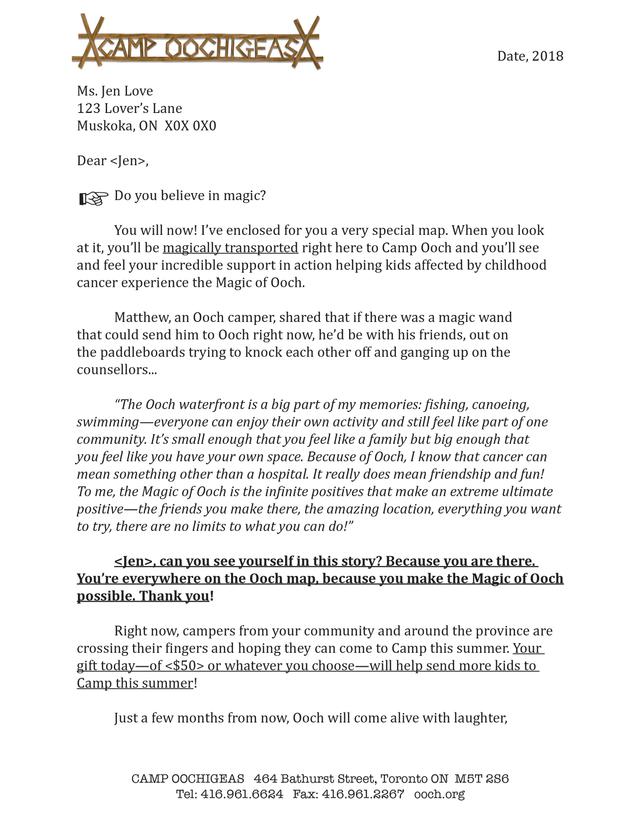 A key to great storytelling is to change the perspective. Sometimes a story that’s been told over and over again can seem completely fresh and new when you change the voice or angle. This is the case for this appeal. Ultimately, every Camp Ooch appeal is about sending kids to camp – but we are always looking for ways to make it interesting to interact with, and to give the donor a fresh perspective on their potential impact.