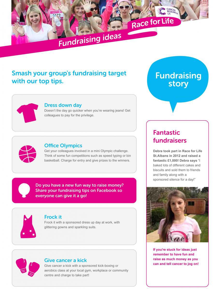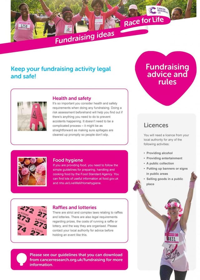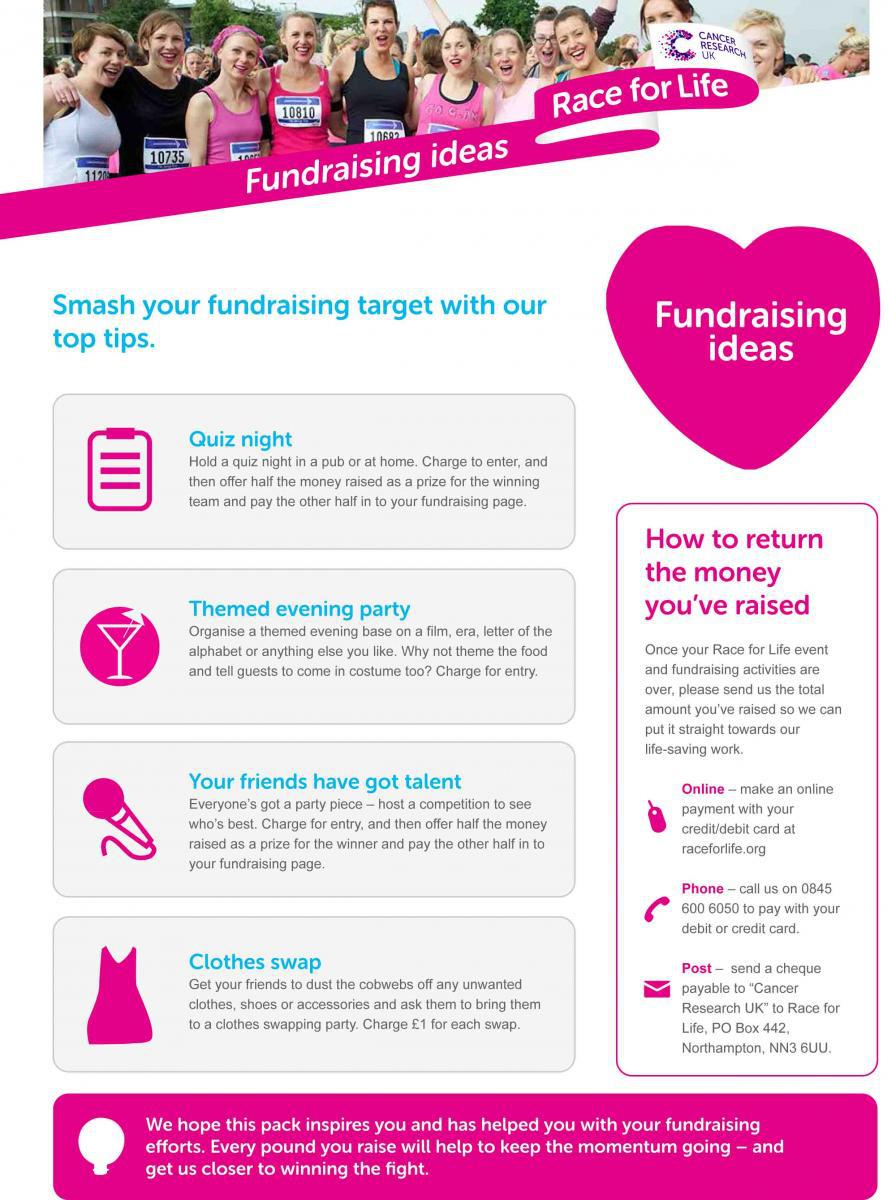 Race for life is a nationwide fundraising event for women only. They walk, jog, or run five kilometres in return for sponsorship to raise funds for Cancer Research UK.