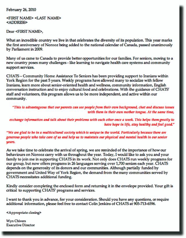 We have approximately 100 Farsi-speaking clients who, research confirmed, were not responding to our ‘traditional direct mail’. Historically they were included in our holiday mailing (generally timed around Christmas), which resulted in packages being mailed and discarded, either because they didn’t understand English or the timing was irrelevant. As one of our largest client segments, it was decided to pilot a mailing specific to this group at a time important to them – in this case Norooz.
