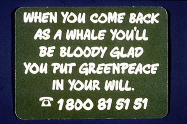 Mir hat der Slogan damals so gut gefallen, dass ich ihn für Greenpeace Kanada adaptiert habe. Aber ich habe das Wort „blutig“ herausgenommen, da es bei uns nicht im gleichen Sinne wie in Australien verwendet wird. Außerdem haben Tests gezeigt, dass es in Kanada nicht gut ankommt. Unsere Version war also „Wenn Sie als Wal zurück auf diese Welt kommen, werden Sie froh sein, dass Sie Greenpeace in ihrem Letzen Willen bedacht haben“. Ich habe diesen Spruch immer verwendet und ließ ihn sogar auf die Rückseite meiner Visitenkarte drucken. Das Interessante daran war, je älter der Unterstützer, umso lustiger fanden sie es.