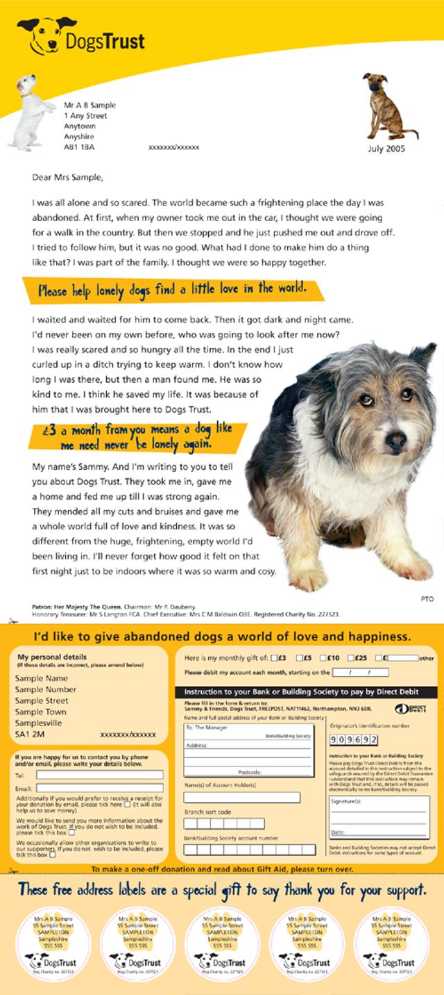 Sebbene l’adozione del cane fosse un fantastico prodotto di fundraising, non venne promosso per parecchi anni. La promozione avveniva tramite pieghevoli e riferimenti sul magazine della NCDL. Gli sponsor ricevevano la foto del “loro” cane quando aderivano ma le altre comunicazioni venivano gestite in modo non sistematico. Non venne creato un dipartimento di fundraising prima del 1991 e fino al 1995 consisteva in una sola persona. Verso la fine del 1994, l’adozione del cane raccoglieva circa 90.000 sterline all’anno- neppure lontanamente vicina alla cifra necessaria a rispondere ai bisogni della charity, soprattutto se doveva diventare un’associazione significativa a livello nazionale. Perciò la NCDL avviò una grande campagna di fundraising in modo da permettere all’organizzazione di rifornire i centri di accoglienza esistenti e di costruirne di nuovi. Si pensava che, usando il direct marketing, si potesse sviluppare un flusso significativo e sicuro di entrate.