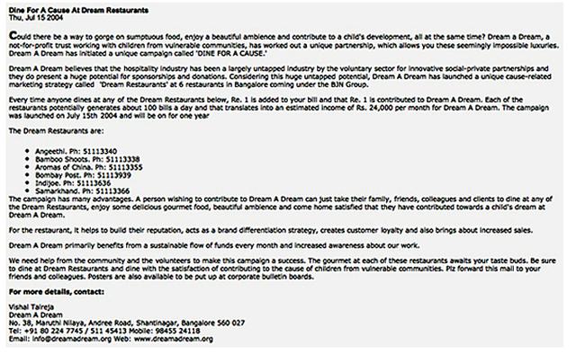 Dream a Dream is one of a small but growing band of entrepreneurial Indian NGOs that are building a vibrant and progressive nonprofit sector in India. Led by some truly visionary and creative fundraisers, Dream a Dream Foundation already has some sparkling fundraising successes to its credit. The idea behind this campaign is simple but stunningly effective, creating a win/win situation for both commercial partner and cause.