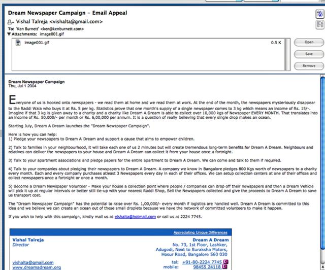 The Dream Newspaper Campaign was an email appeal explaining how the average household collects around three kilos of newspapers a month, which if sold at five rupees per kilo would amount to an income of 15 rupees. If Dream a Dream was then able to collect around 10,000 kilos a month this would amount to an income of 50,000 rupees per month, or 600,000 rupees a year.