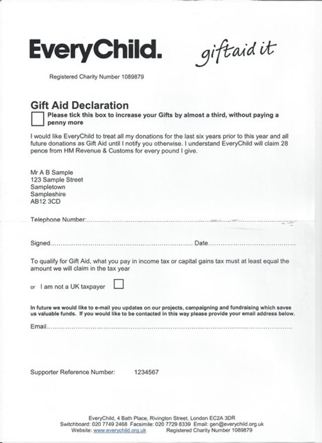 It’s astonishing to learn that, at the time of writing, 40 per cent of UK charities are not claiming all the Gift Aid that they can. If your charity is one of them, this simple mailing from EveryChild will show you how you can raise a lot of money just by getting your donors to tick a box. It is that simple.