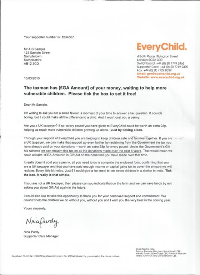 - It made the offer very specific by laser-printing the exact personalised amount of tax that EveryChild might be able to claim based on the donor’s giving history. In some cases this came to hundreds of pounds.
