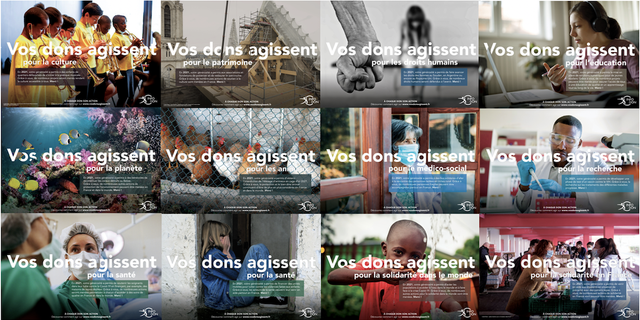 The #VosDonsAgissent campaign was based on the nine social missions of the charities and foundations that are members of our collective: human rights, culture, education, medical and social, the planet, research, health, global solidarity, and solidarity within France.